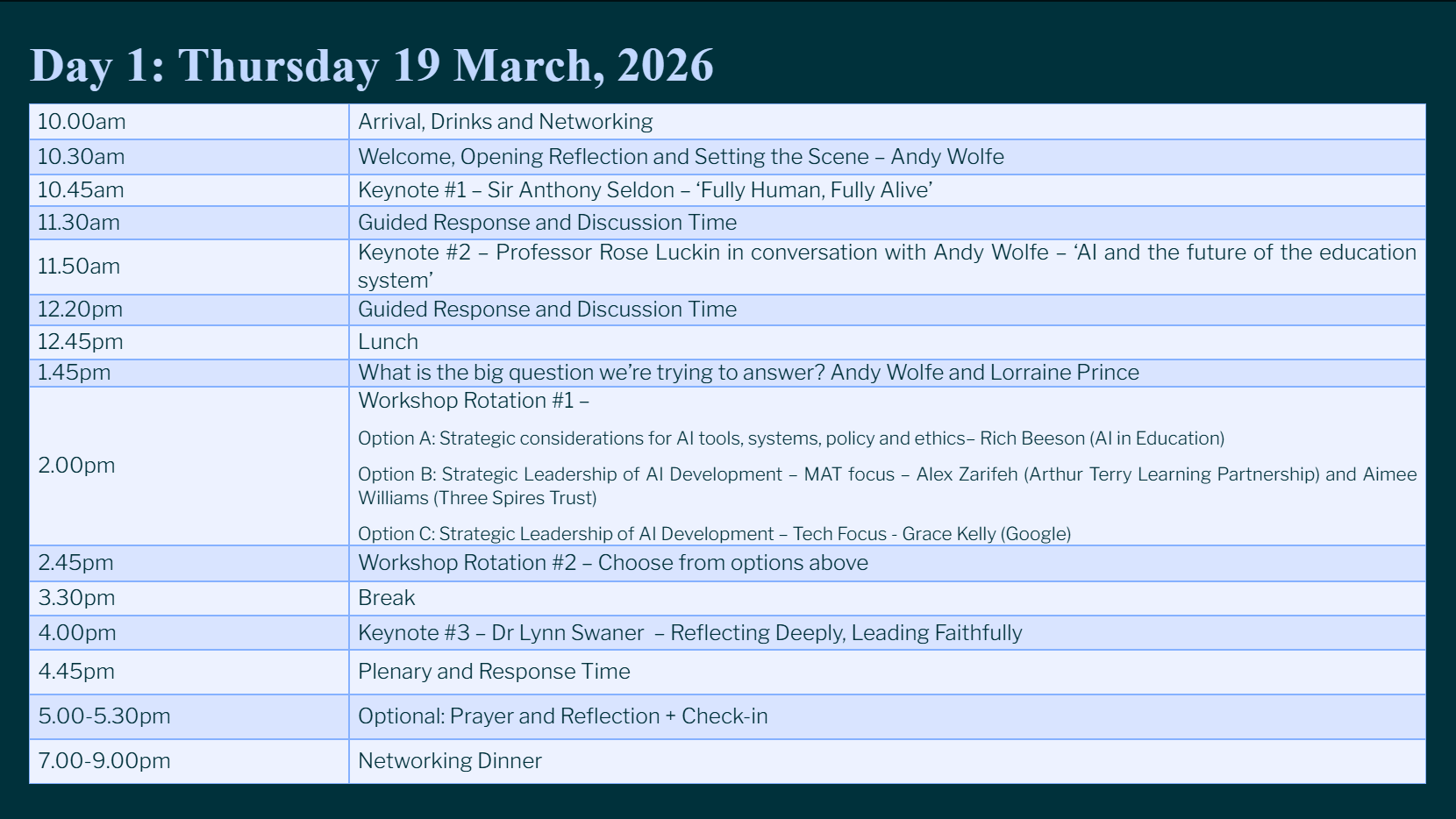 Fully Human, Fully Alive – AI and Human Flourishing is a two-day development residential for Trust Leaders, Diocese colleagues and International Education System Leaders, taking place on 19–20 March 2026 at The Park Regis, Birmingham.